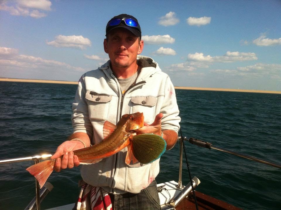 After we finished fishing the drifts around Portland bill we decided to fish opposite Chessil beach. At this point I changed my set up to a running ledger with a 8oz weight and 2.0 Hooks. This aloud me to cut up my fresh caught mackerel into thin strips, Perfect for Pout! This rig proved very effective catching me Bream, Pout, Pout whiting, Wrasse and dog fish. after about two hours into fishing in this spot Austin Weeding hooked into his first ever Tub Gurnard that he caught on rag worm and a one squid's head. I estimate it was 2LB, but that does not matter as he was over the moon with catching this fish because he set about catching one all day! Well done Austin!!! :)